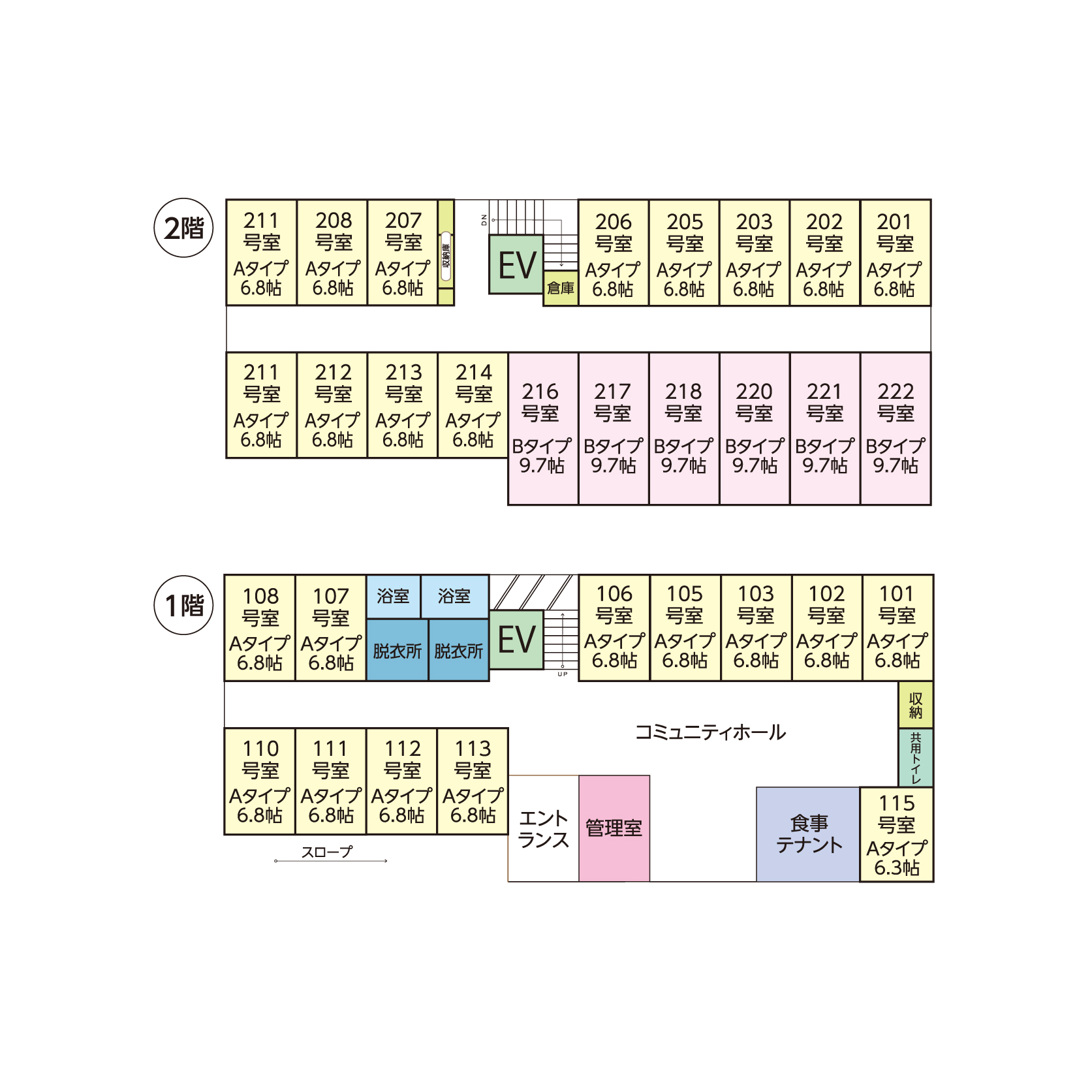 ・共有設備:コミュニティーホール・食堂(ダイニング)・介護バス(車イス対応)・浴室(ユニットバス)・洗濯機・カラオケ・エレベーター