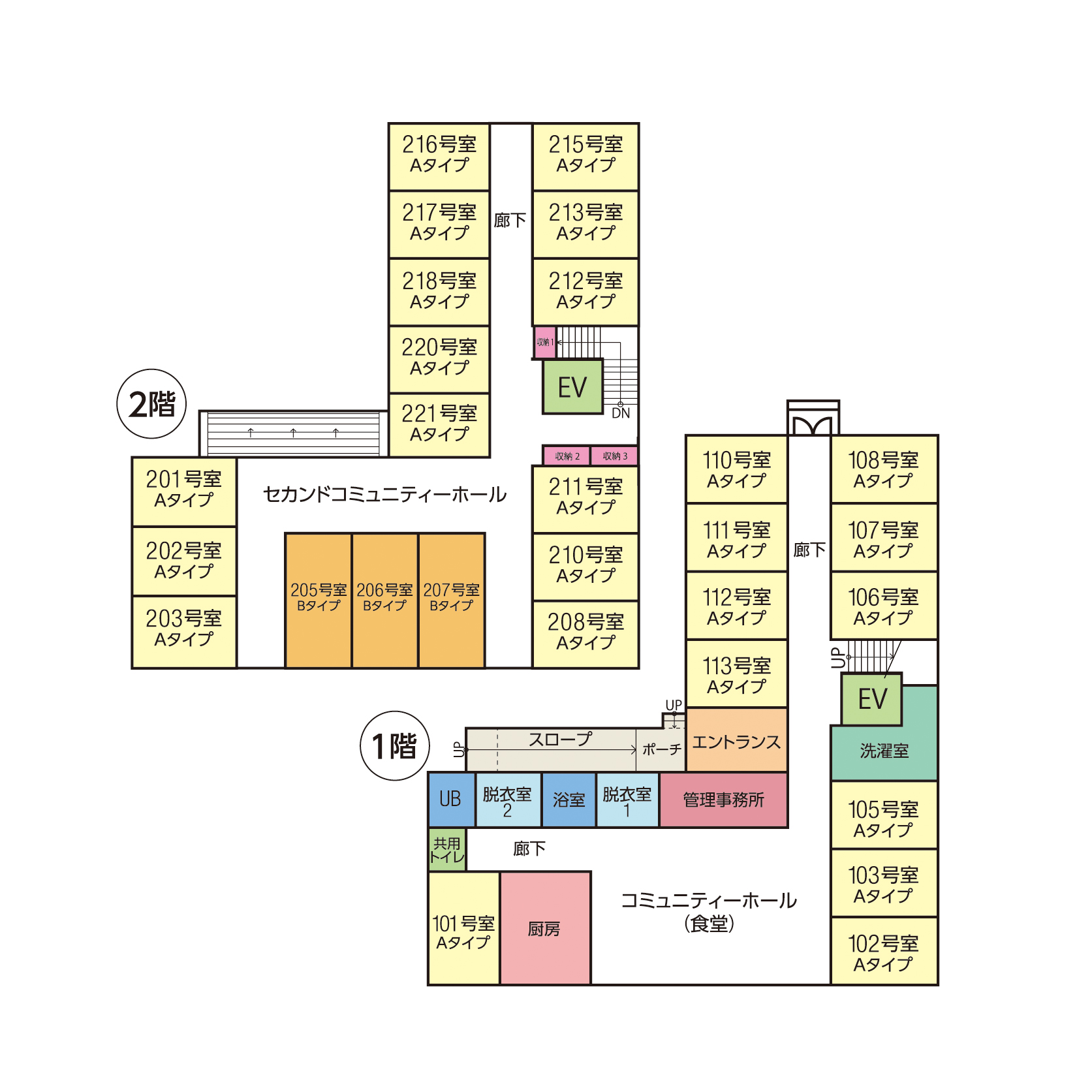 ・共有設備:コミュニティーホール・食堂(ダイニング)・介護バス(車椅子対応)・浴室(ユニットバス)・洗濯機・カラオケ・エレベーター