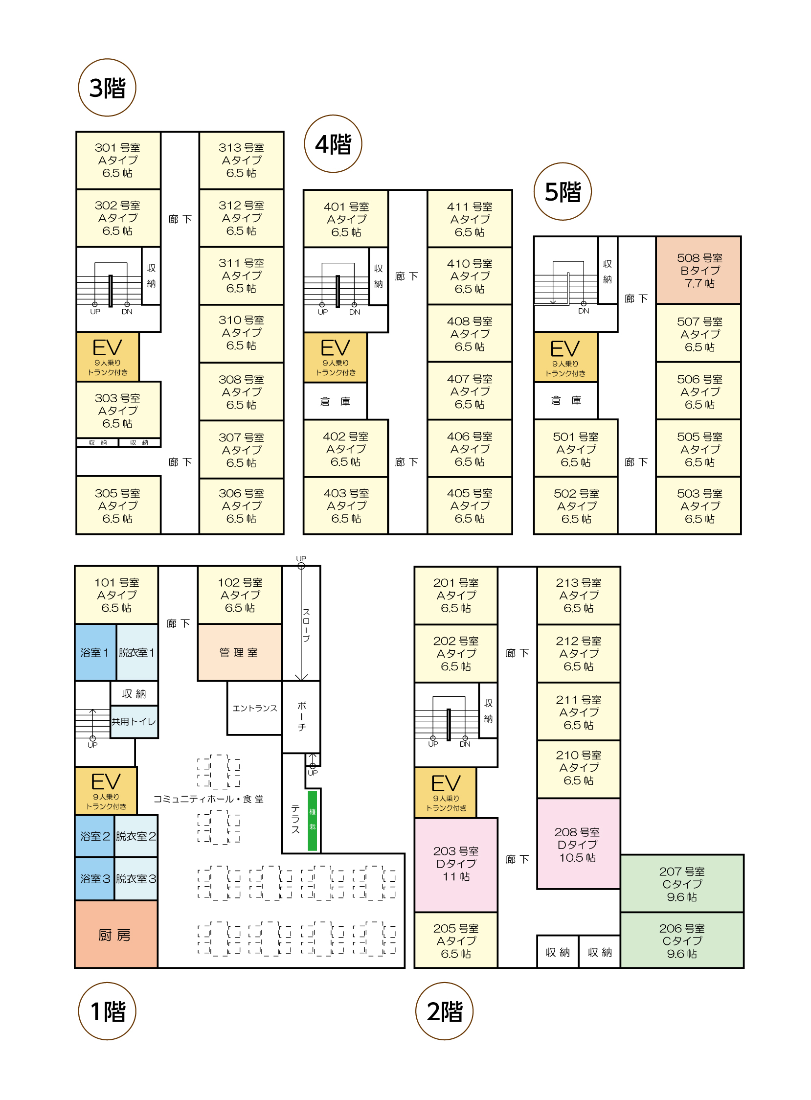 ・個室設備:トイレ(間切り無し)・洗面台・防火カーテン・エアコン・スプリンクラー・照明器具