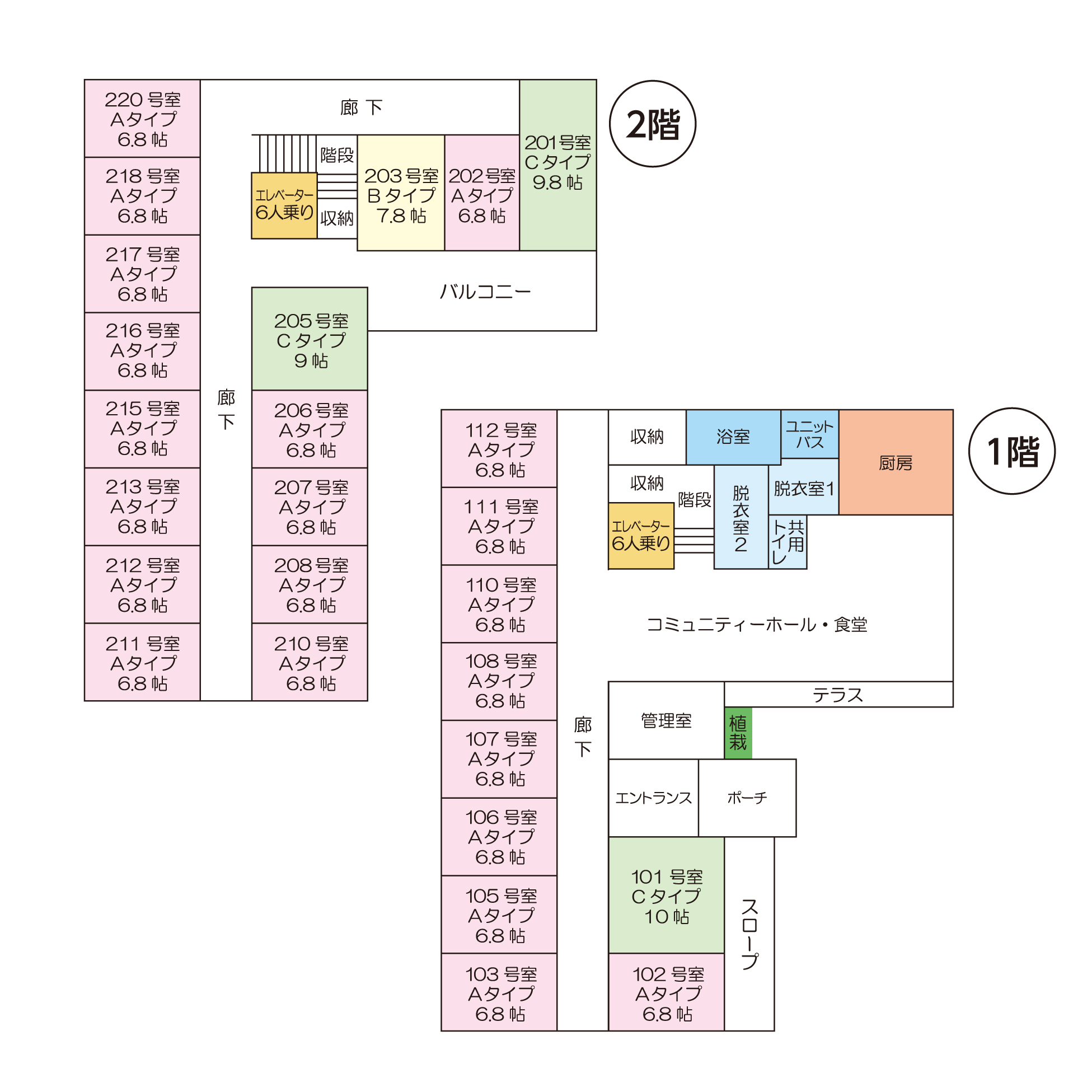 ・共有設備:コミュニティーホール・食堂(ダイニング)・浴室(ユニットバス)・バスリフト付き(車椅子対応)・洗濯機・エレベーター
