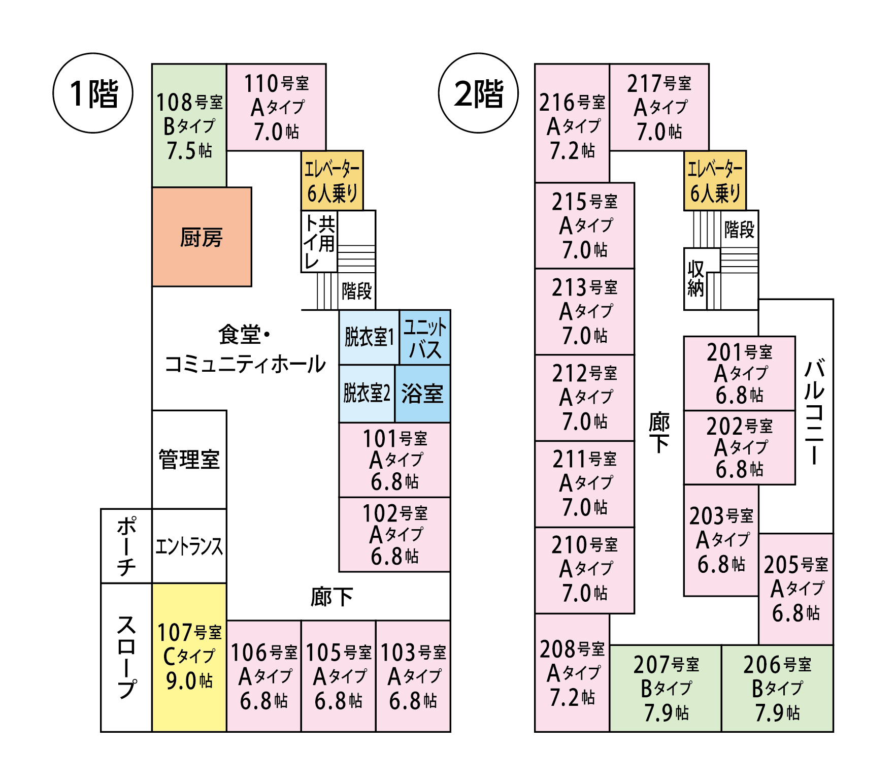 ・共有設備:コミュニティーホール・食堂(ダイニング)・浴室(ユニットバス)・バスリフト付き(車椅子対応)・洗濯機・エレベーター