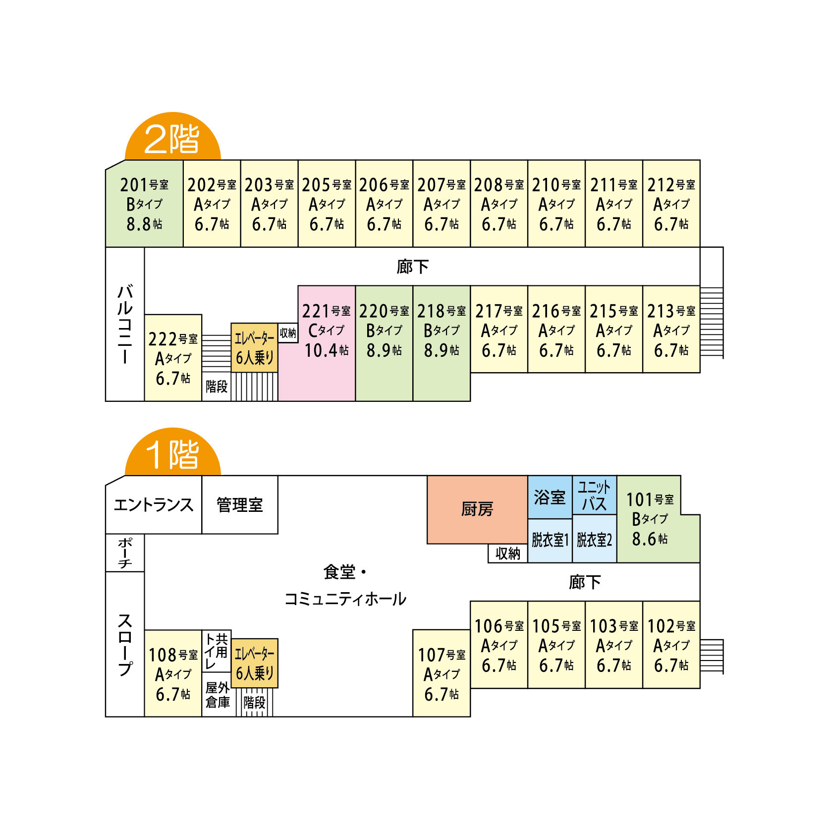 ・共有設備:コミュニティーホール・食堂(ダイニング)・浴室(ユニットバス)・バスリフト付き(車椅子対応)・洗濯機・エレベーター