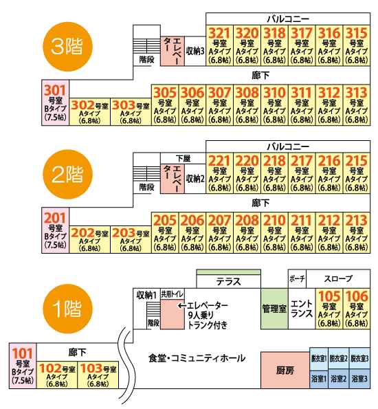 ・共有設備:コミュニティホール・食堂(ダイニング)・洗濯機・エレベーター・浴室(ユニットバス)・バスリフト付き(車椅子対応)