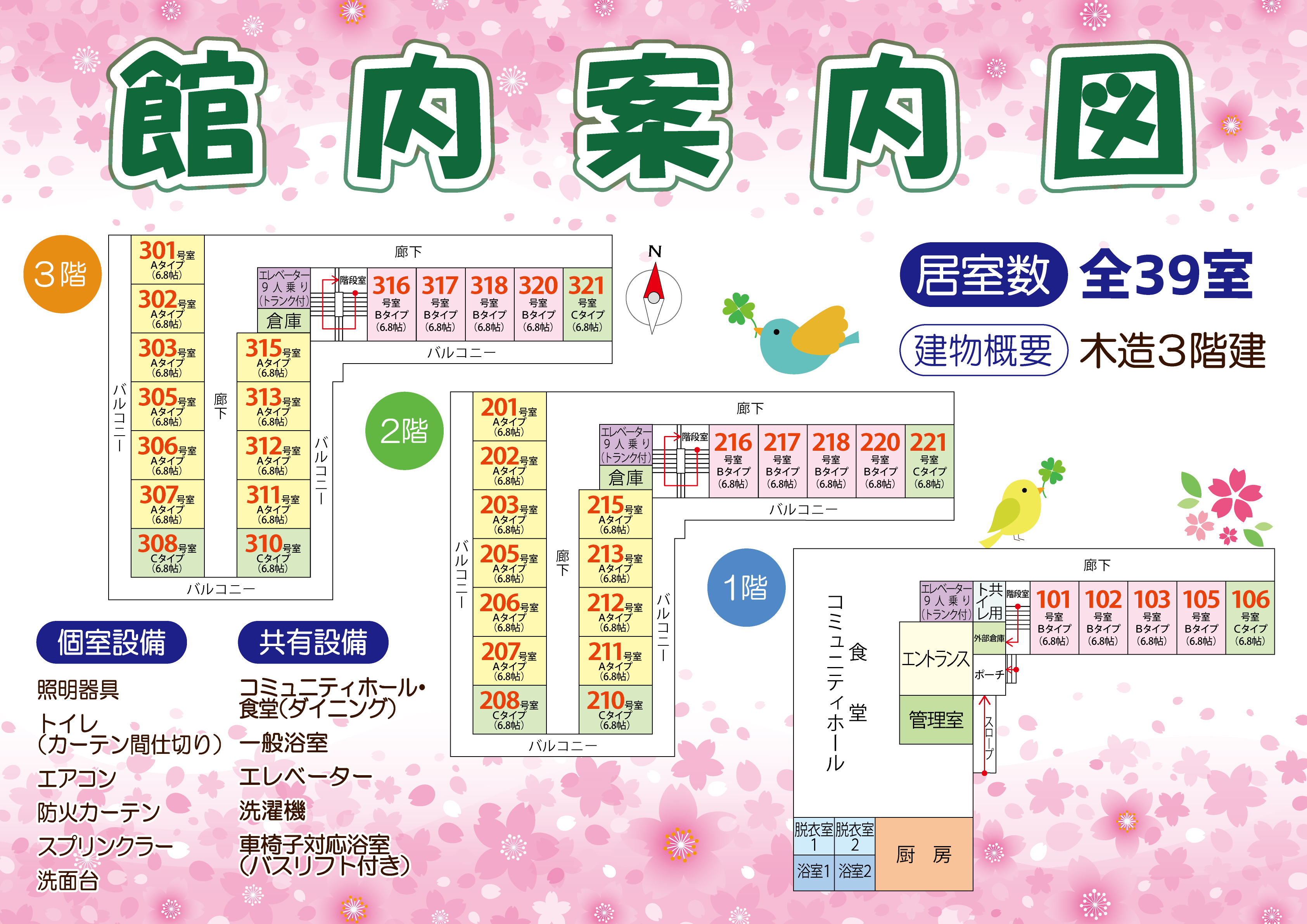 ◆共有設備:コミュニティホール・食堂(ダイニング)・洗濯機・エレベーター・車椅子対応浴室(バスリフト付き)・一般浴室