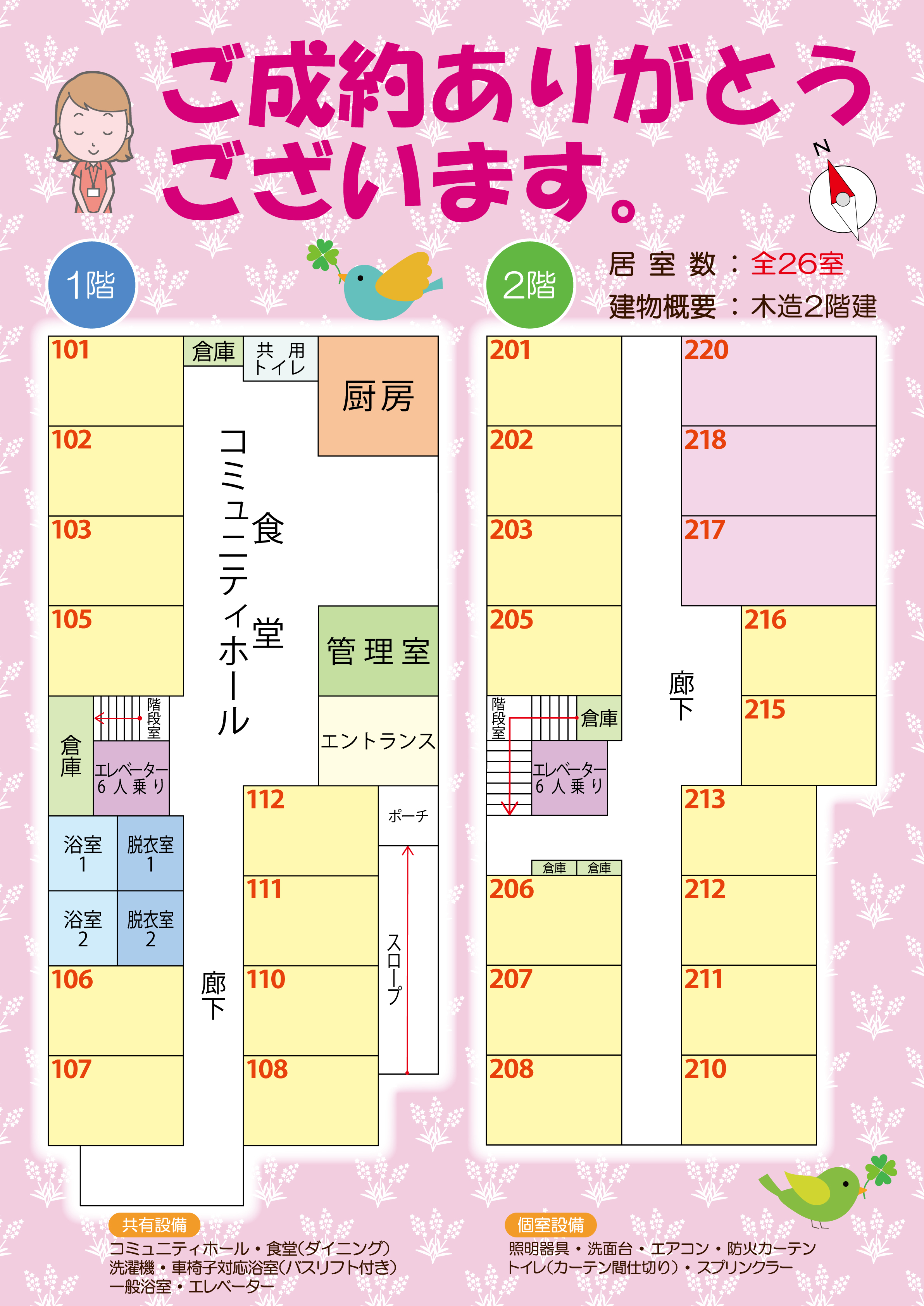 ◆共有設備:コミュニティホール・食堂(ダイニング)・洗濯機・エレベーター・車椅子対応浴室(バスリフト付き)・一般浴室・車椅子対応浴室(バスリフト付き)
